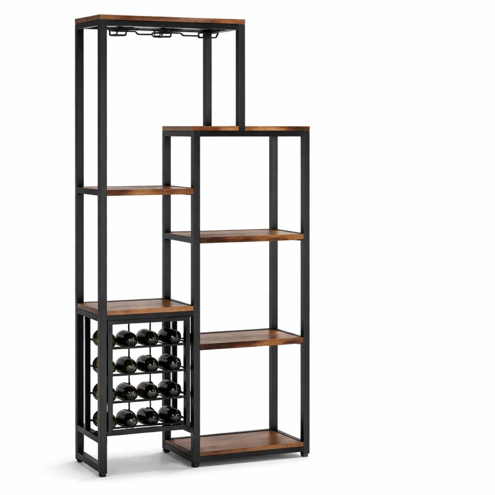 Retro-Holz-Finish kombiniert mit schwarzem Rahmen erzeugt einen industriellen Stil, der zu vielen Wohnstilen passt. Das Weinregal ist vielseitig einsetzbar und eignet sich für Diele, Wohnzimmer, Keller oder Barbereiche. Es bietet eine praktische Kombination aus Aufbewahrungsregal, Weinglashalter und Weinflaschenhalter. Offene Ablageflächen bieten Platz für Dekanter, Barutensilien und mehr. Der Glashalter kann 6-9 Stielgläser aufnehmen, und das Regal hält bis zu 12 Weinflaschen. Die Installation ist flexibel und kann links und rechts ausgetauscht werden. Kombinierbar mit mehreren Regalen für eine erweiterte Lösung zur Organisation Ihrer Weinsammlung. Hergestellt aus MDF und Metall, ist es stabil und langlebig. Verstellbare Fußpolster sorgen für Stabilität, selbst auf unebenen Böden. Es ist einfach zu montieren und pflegeleicht, dank des wasserabweisenden und kratzfesten MDF-Materials.